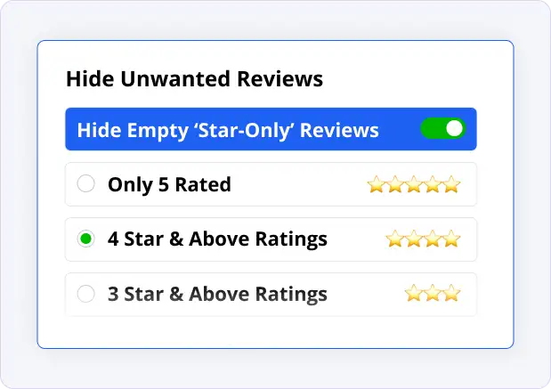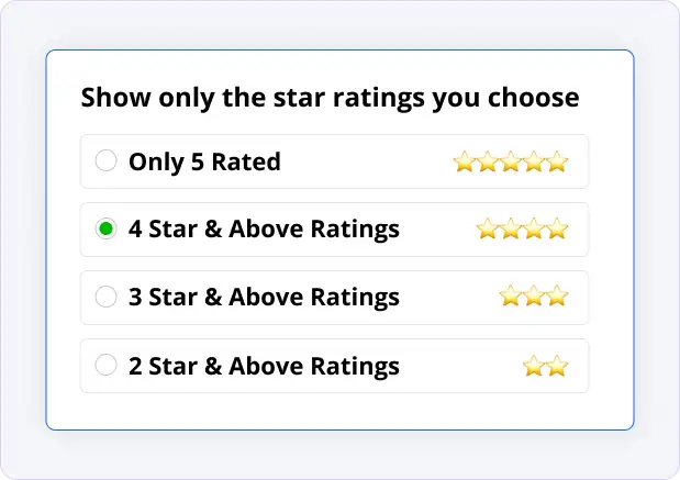 Set a star threshold (e.g., only 4★/5★) or choose to show all reviews—so you control how your website presents your reputation.