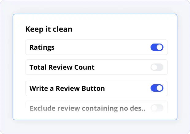 Turn elements on or off — such as the “Write a Review” button, review dates, reviewer icons, and total review count—to keep the layout simple and conversion-focused.