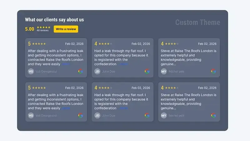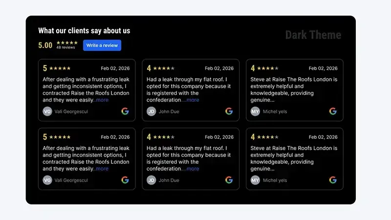 Control fonts, colours (backgrounds, borders, stars), and Light/Dark themes—so the widget looks like it was designed for your restaurant, not pasted in.