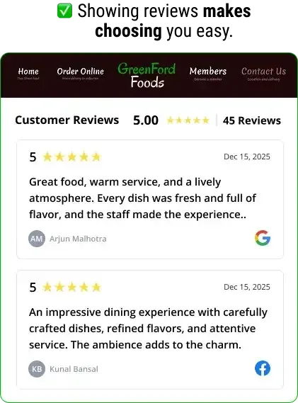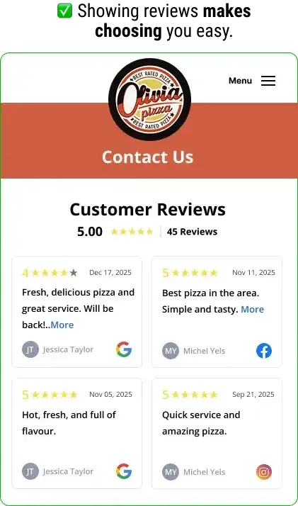 Pull reviews from Google Business Profile + Facebook into a single showcase—so diners see proof from more than one platform (and your social proof looks stronger instantly).