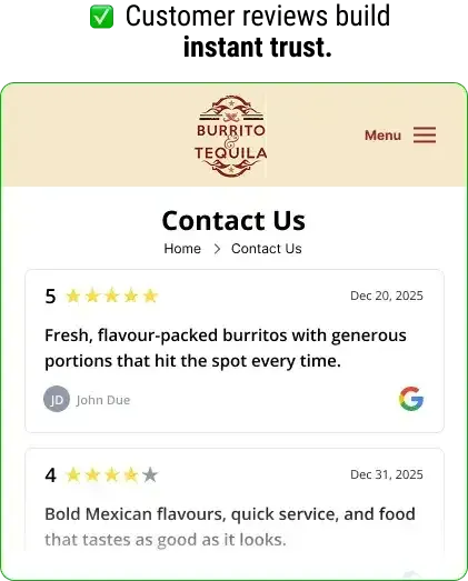 “We put this on our booking page and it instantly made the site feel more trustworthy. Clean layout, looks great on mobile.” - Florence Z, Burrito & Tequila